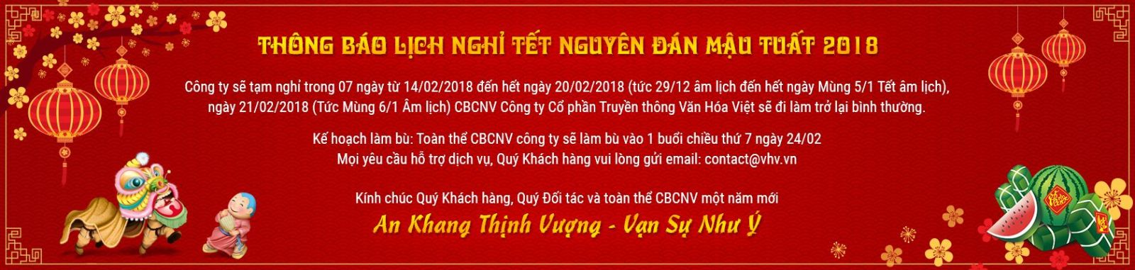 Nhân dịp tết Mậu Tuất 2018 đang đến gần, BGĐ Công ty Cổ phần Truyền thông Văn Hóa Việt xin gửi lời cảm ơn chân thành và kính chúc Quý khách hàng, Qúy Đối tác, CBCNV công ty cùng gia đình có một năm mới An Khang – Thịnh Vượng, Vạn Sự - Như Ý.