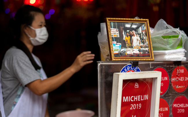 Người đàn ông 42 tuổi này cẩn thận đặt khung ảnh cha mình, cụ Chanchai, phía trên quầy hàng cùng sao Michelin (chứng nhận về ẩm thực danh giá) từ năm 2018-2021.